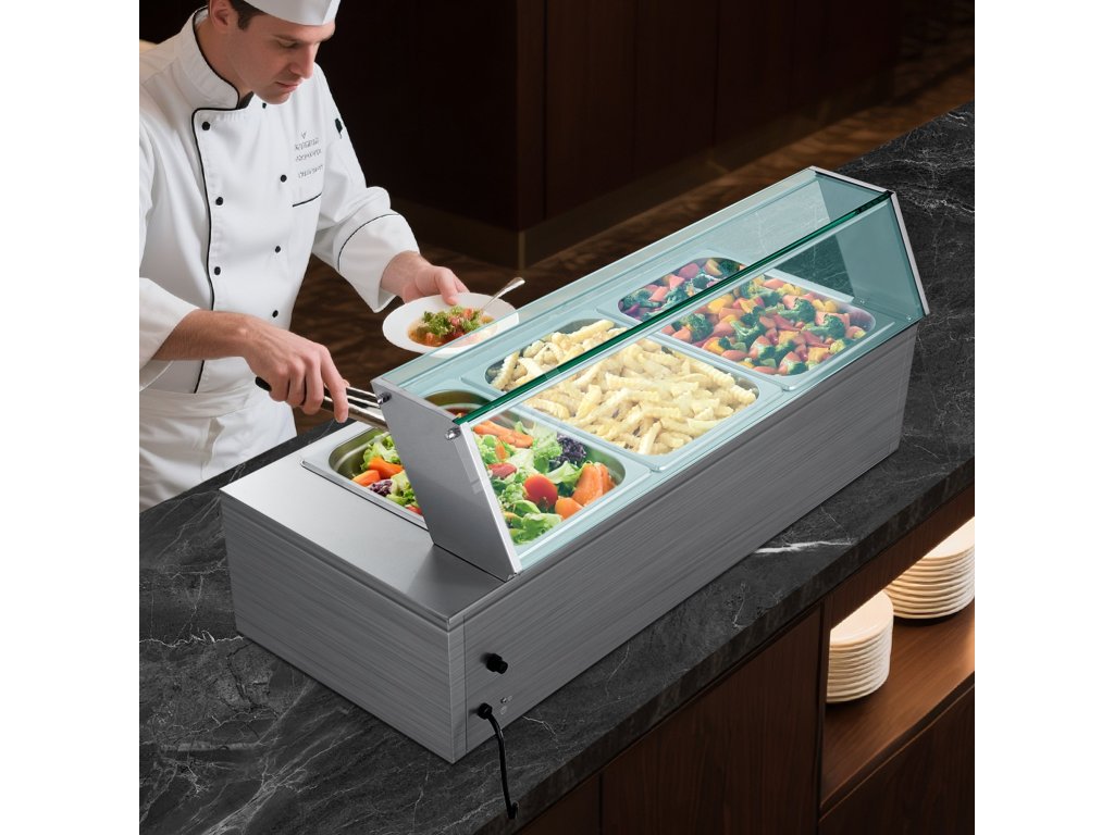 Náš komerčný ohrievač potravín sa dodáva s 3 x 8qt nádobami na potraviny spolu s príslušnými vekami, čo vám umožní ohrievať viac potravín naraz. Udržujte svoje chutné pokrmy trvalo teplé počas dlhšieho obdobia, čo je ideálne pre rušné komerčné kuchyne.