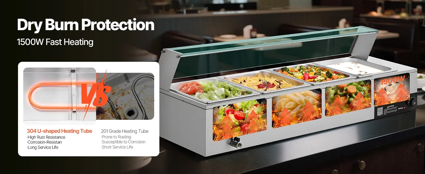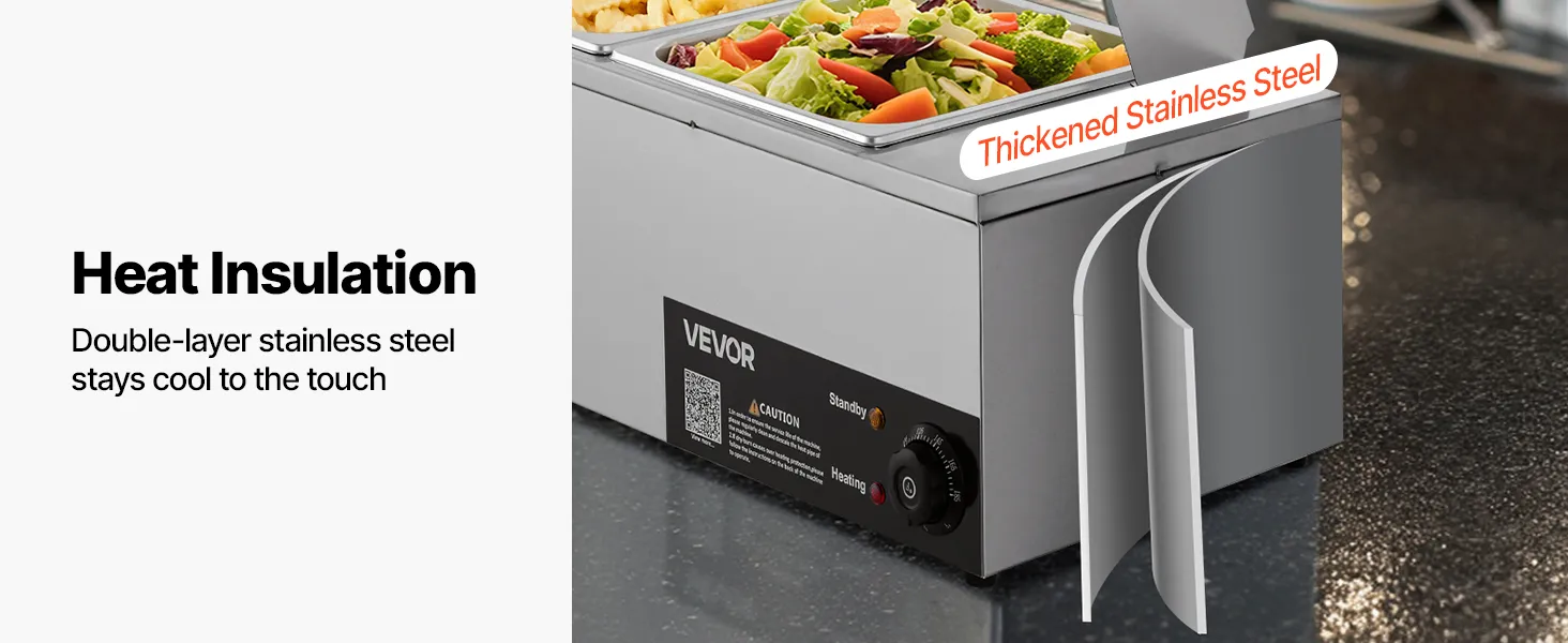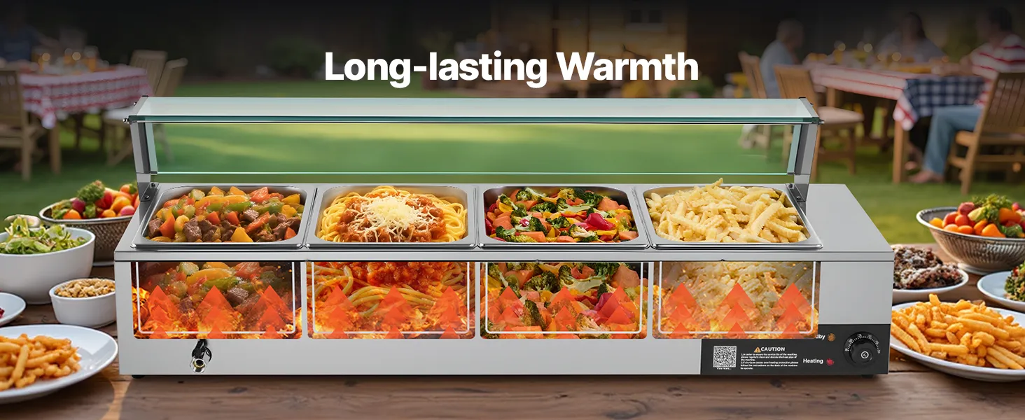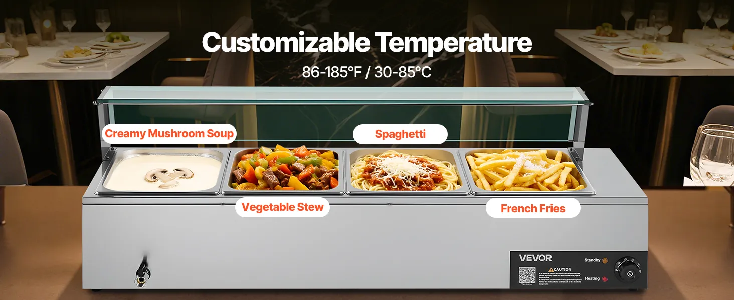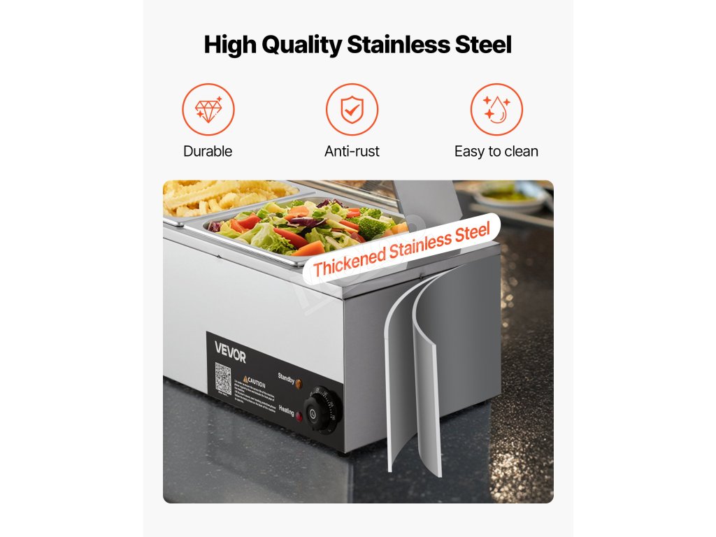 Táto ohrievacia stanica vyrobená z nehrdzavejúcej ocele pre dlhú životnosť a jednoduché čistenie je vybavená širokou ohrievacou trubicou v tvare U, nastaviteľnou teplotou (30-85 °C) a veľkou komorou ideálnou pre hotely, bufety, stánky s občerstvením a vonkajšie párty.