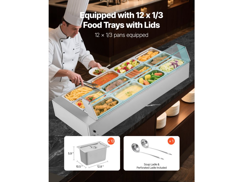 Náš komerčný ohrievač potravín sa dodáva s 12 x 5qt nádobami na potraviny spolu s príslušnými vekami, čo vám umožní ohrievať viac potravín naraz. Udržujte svoje chutné pokrmy trvalo teplé počas dlhšieho obdobia, čo je ideálne pre rušné komerčné kuchyne.