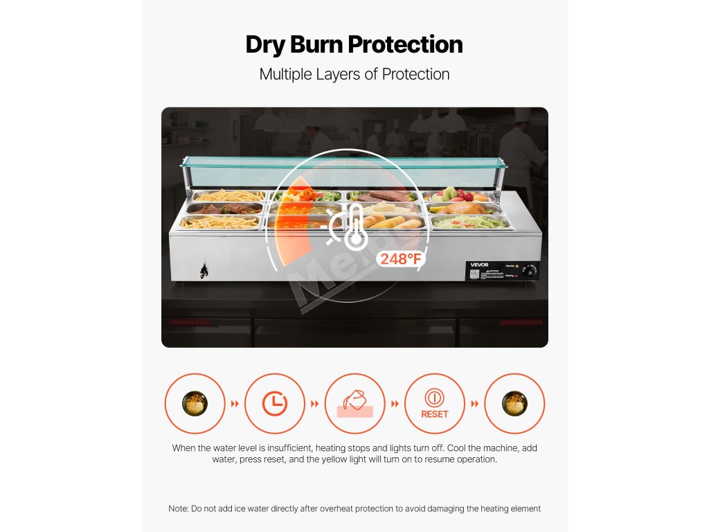 Systém ochrany proti spáleniu nasucho automaticky kontroluje, či hladina vody neklesne pod požadovanú úroveň, pričom vás na stav spálenia nasucho upozorní svetelný indikátor a automaticky zastaví ohrev. Jednoducho doplňte vodu a stlačením tlačidla "Reset" obnovte normálnu prevádzku.