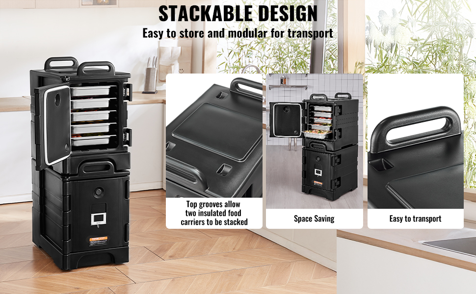 Dizajn s hornou drážkou umožňuje stohovanie dvoch nosičov potravín, čím sa šetrí úložný priestor a uľahčuje modulárna preprava.