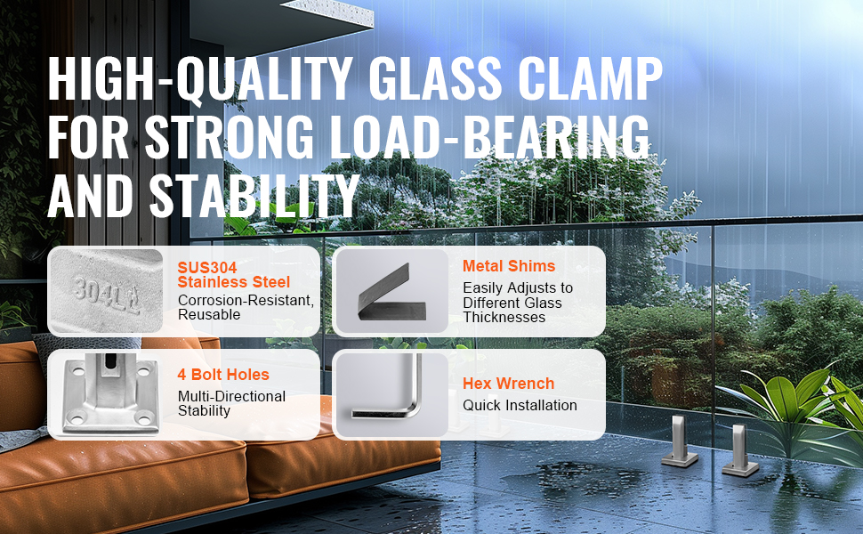 Naša svorka na sklo je vyrobená z prvotriednej nehrdzavejúcej ocele, odolnej voči korózii a vhodnej do všetkých poveternostných podmienok. Možno ju opakovane používať a ľahko sa prispôsobí rôznym hrúbkam skla.