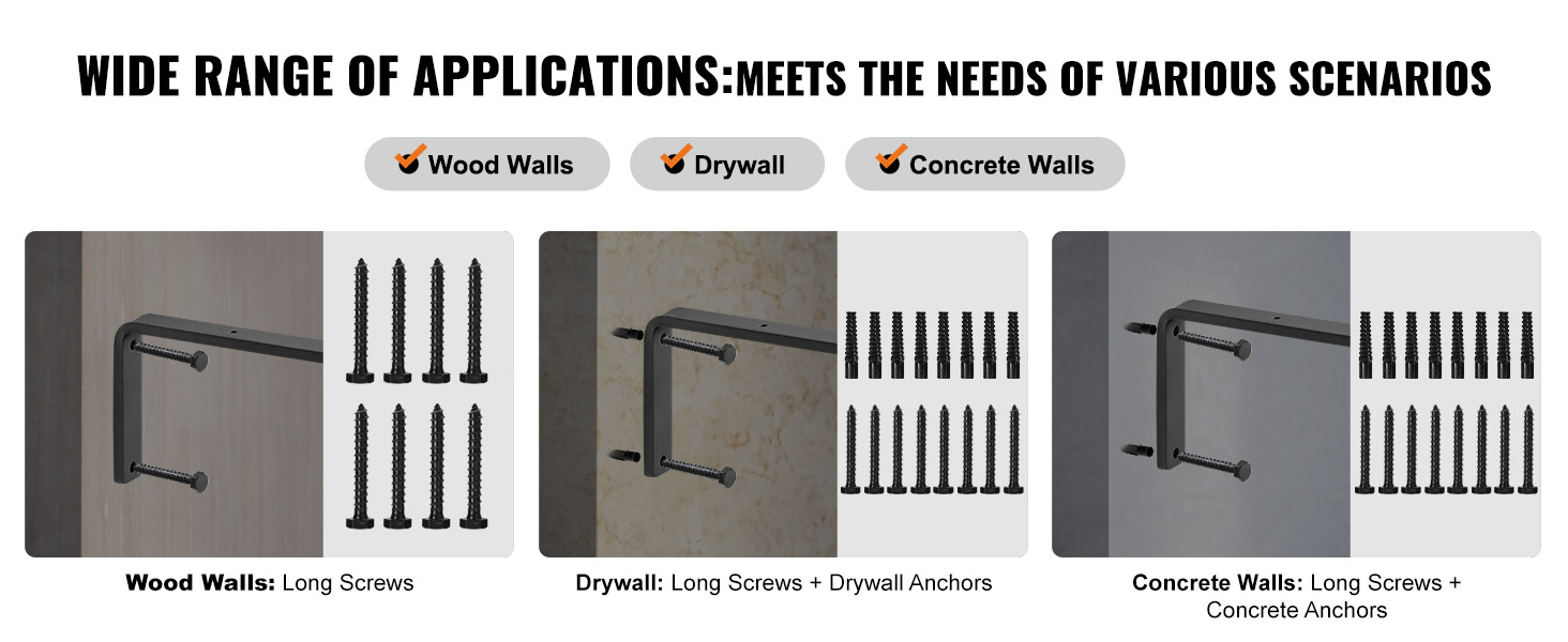 K dispozícii sú rôzne skrutky a skrutky na prispôsobenie držiaka rôznym povrchom stien, čím sa zabezpečí stabilná nosnosť aj na rôznych stenách.