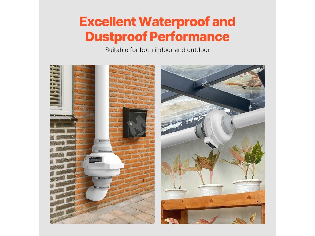 Radónový ventilátor 4–4.5 inch, 380 cfm, tichý, vodotesný, 2 spojky
