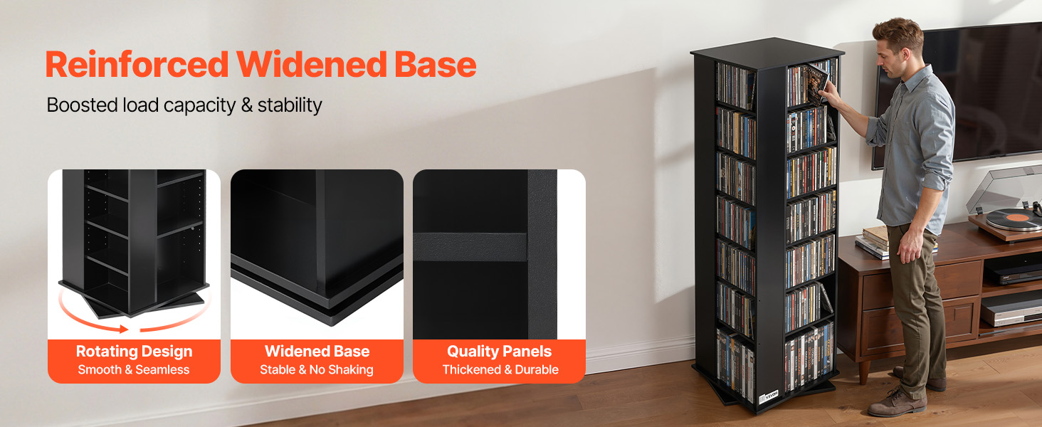 Táto skriňa na DVD je vybavená rozšírenou základňou, vďaka čomu má zvýšenú stabilitu a pevne drží na mieste. Táto pevná konštrukcia pomáha chrániť vašu cennú zbierku a poskytuje vám pokoj pri každodennom používaní.