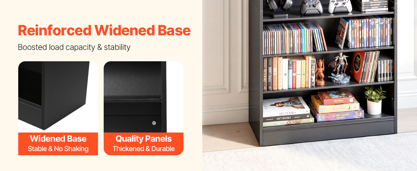 Táto skriňa na DVD je vybavená rozšírenou základňou, vďaka čomu má zvýšenú stabilitu a pevne drží na mieste. Táto pevná konštrukcia pomáha chrániť vašu cennú zbierku a poskytuje vám pokoj pri každodennom používaní.