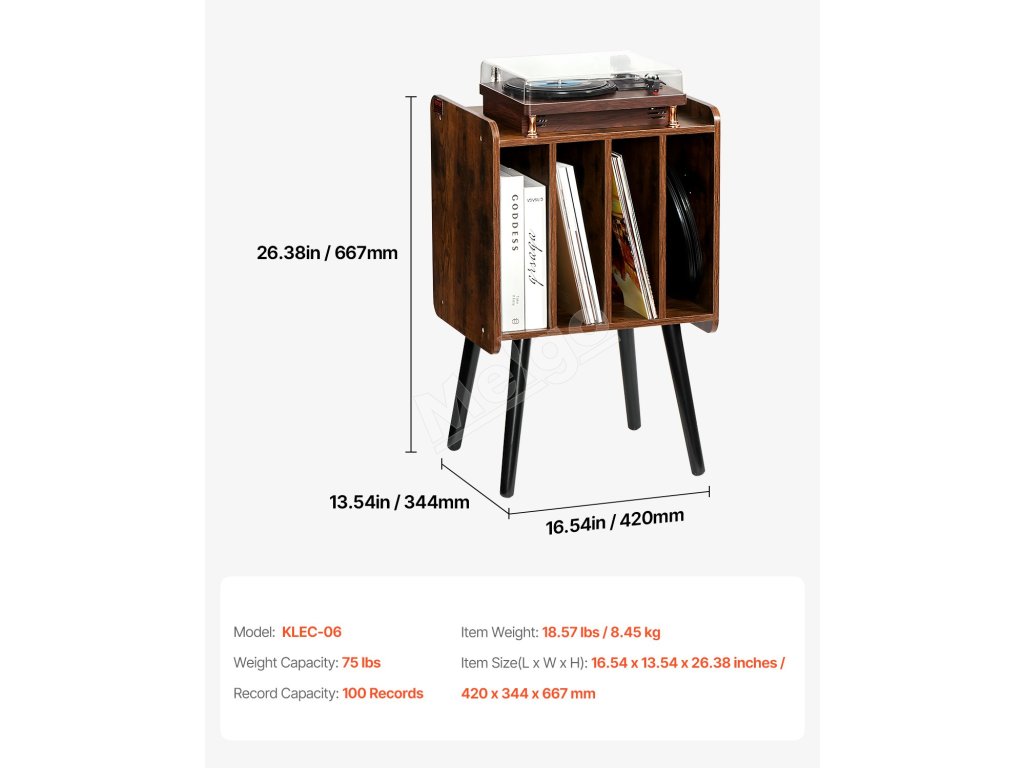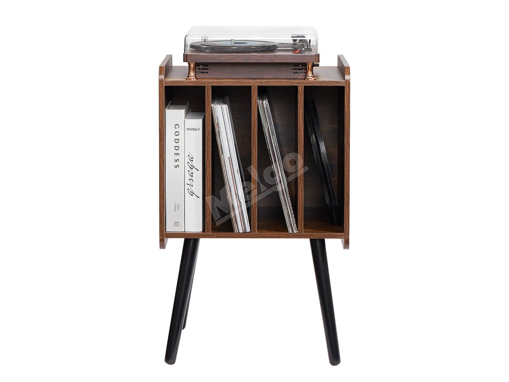 Vintage hnedé priečky dodávajú stojanu nádych charakteru, zatiaľ čo polica pre gramofón unesie až 75 kg a poskytuje spoľahlivú oporu pre váš gramofón a platne.
