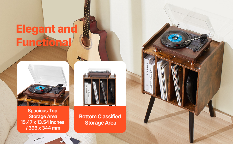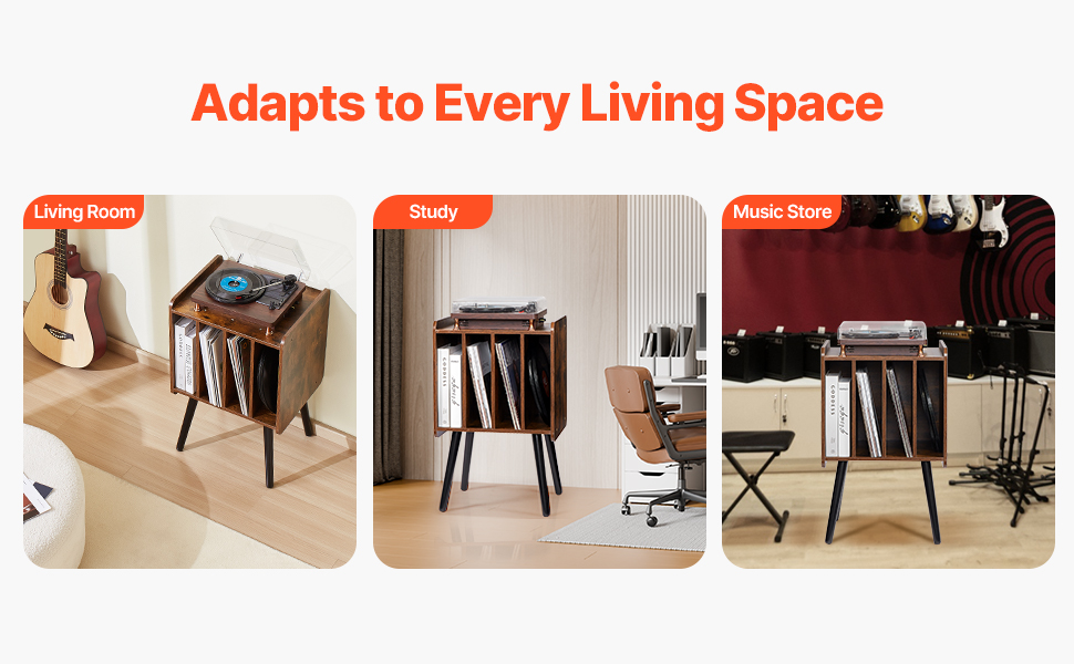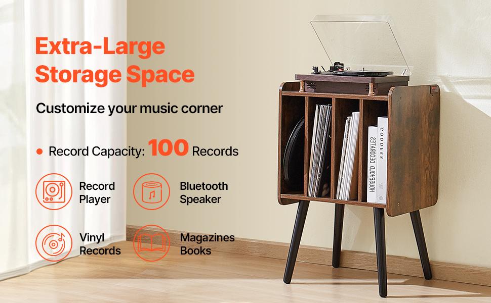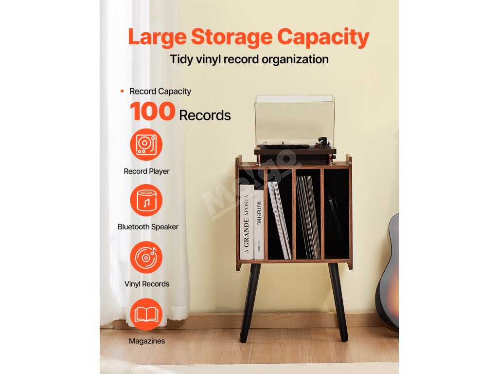 Tento stojan na gramofón s priestrannou doskou a otvoreným úložným priestorom vám poskytne dostatok miesta na usporiadanie vašej zbierky vinylov, do ktorej sa ľahko zmestí až 100 albumov. Je to skvelý stojan na vinylové prehrávače, ktorý vytvorí štýlové miesto, na ktorom budú vaše albumy a gramofón vystavené.