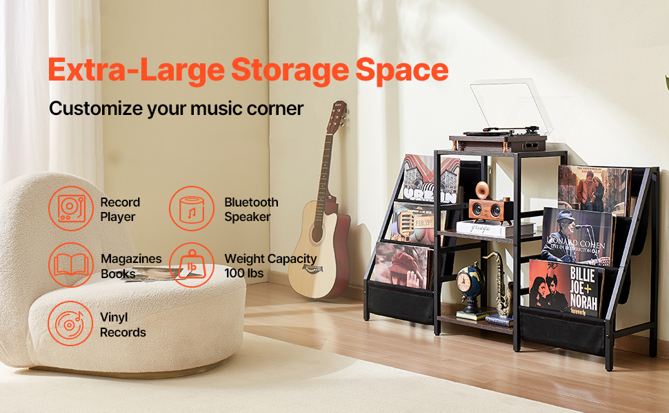 Tento stojan na gramofón s priestrannou doskou a otvoreným úložným priestorom vám poskytne dostatok miesta na usporiadanie vašej zbierky vinylov. Je to skvelý stojan na vinylové prehrávače, ktorý vytvorí štýlové miesto, na ktorom budú vystavené vaše albumy a gramofón.