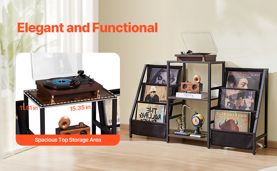 Široká, priestranná stolová doska tohto stojana na gramofóny poskytuje dostatok miesta pre gramofóny všetkých veľkostí, čím zabezpečuje, že vaše zariadenie bude sedieť bezpečne a bez obáv z prevrátenia.