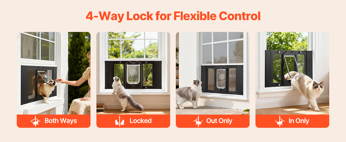 Tieto okenné dvierka pre mačky umožňujú prepínať medzi režimom iba dovnútra, iba von, obojsmerným prístupom alebo úplným uzamknutím. Ľahko kontrolujte vstup a výstup vašej mačky, aby ste si zachovali pokojný a dobre spravovaný domov.