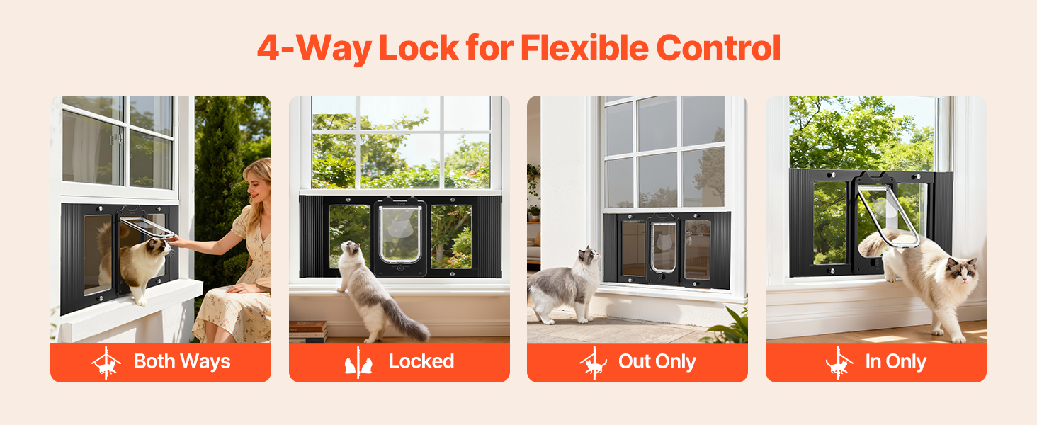 Tieto okenné dvierka pre mačky umožňujú prepínať medzi režimom iba dovnútra, iba von, obojsmerným prístupom alebo úplným uzamknutím. Ľahko kontrolujte vstup a výstup vašej mačky, aby ste si zachovali pokojný a dobre spravovaný domov.