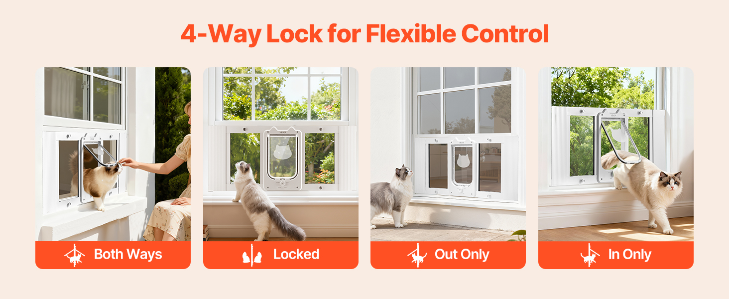 Tieto okenné dvierka pre mačky umožňujú prepínať medzi režimom iba dovnútra, iba von, obojsmerným prístupom alebo úplným uzamknutím. Ľahko kontrolujte vstup a výstup vašej mačky, aby ste si zachovali pokojný a dobre spravovaný domov.