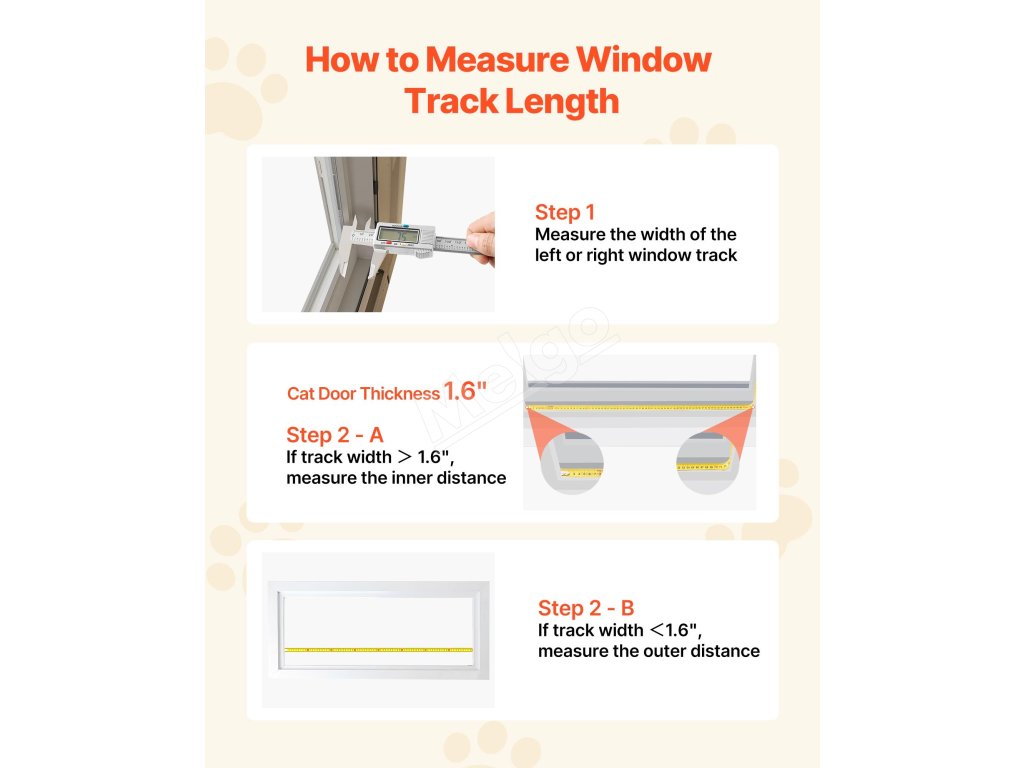 Pred nákupom si ich zmerajte. Ak je vaša okenná dráha širšia ako 1,6-palcová hrúbka dvierok pre mačky, zmerajte dĺžku vnútornej dráhy; ak je užšia, zmerajte vonkajšiu dráhu. Dvakrát skontrolujte svoje miery, aby ste sa uistili, že spadajú do nastaviteľného rozsahu.