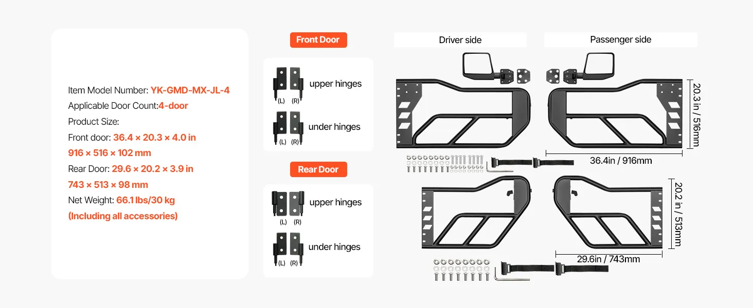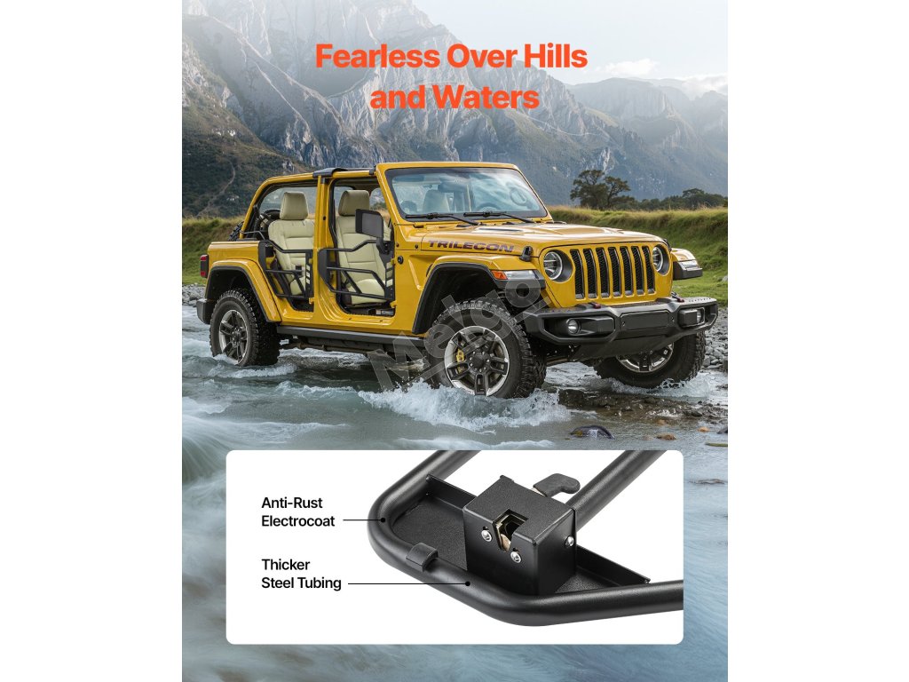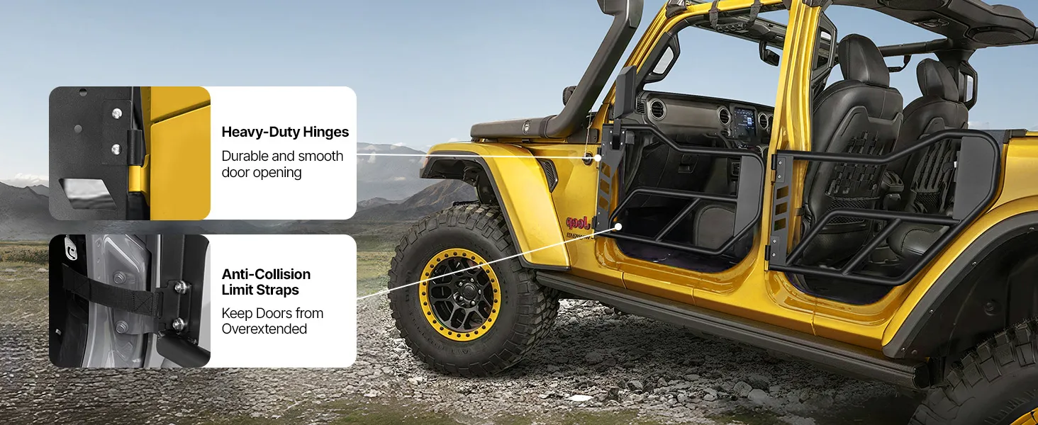 Naše rúrkové dvere Jeep sú ideálnym vylepšením pre dobrodružstvo pod holým nebom. Sú navrhnuté tak, aby pasovali na závesy a západky z výroby, zlepšujú viditeľnosť, zlepšujú prúdenie vzduchu a robia jazdu v teréne citlivejšou a príjemnejšou.
