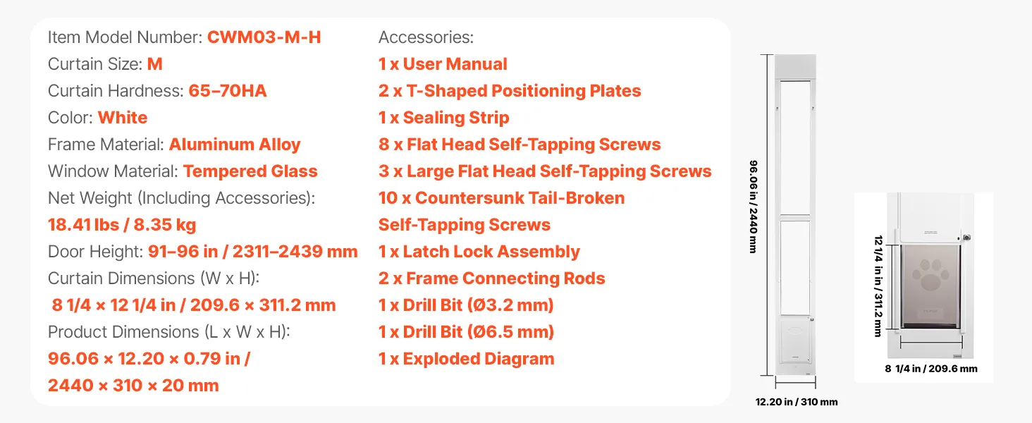 | Výška dverí | 91-96 palcov / 2311-2439 mm |