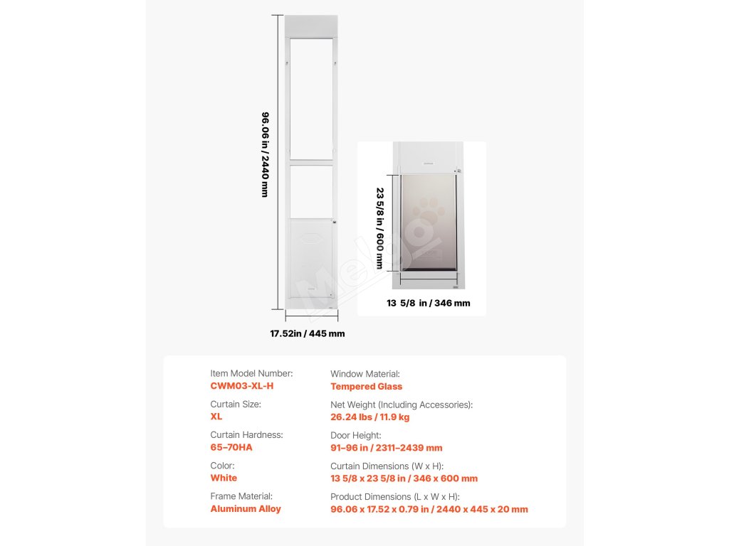 | Výška dverí | 91-96 palcov / 2311-2439 mm |