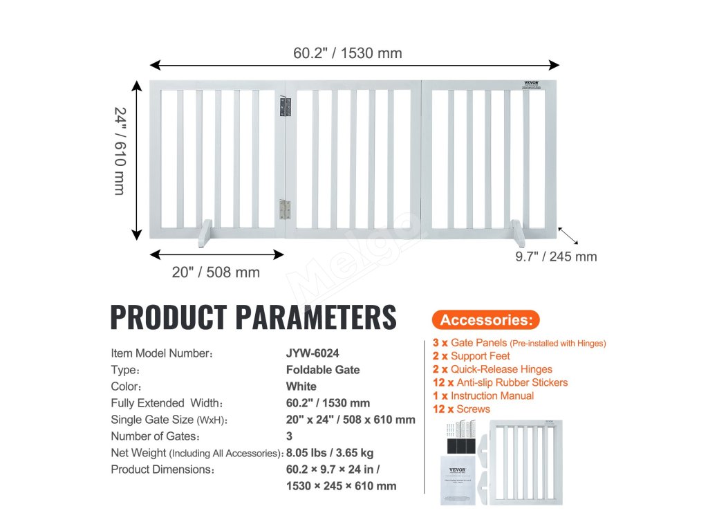 Samostatne stojaca bránka pre psa 24"×60", 3 panely, skladacia, biela