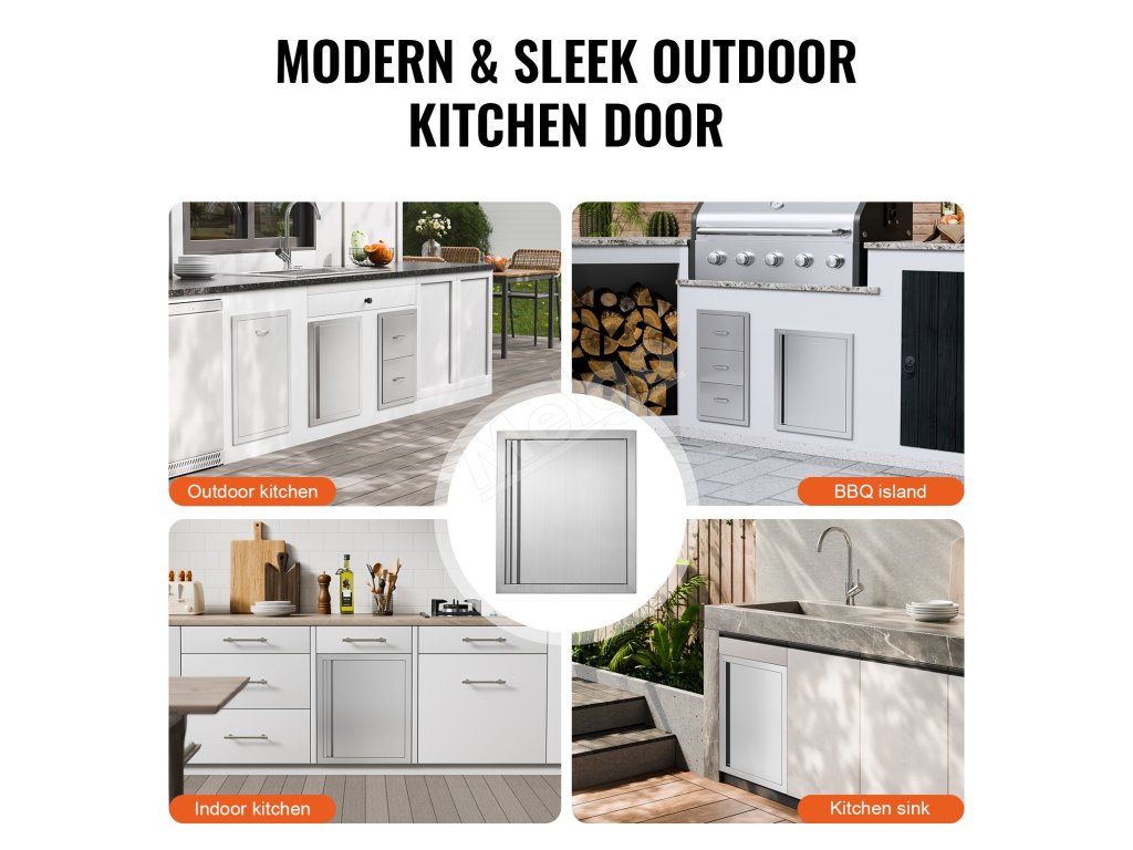 Dvierka vonkajšej kuchyne sú vybavené skrytou rukoväťou pre úhľadnejší a estetickejší vzhľad. Hrany rámu dvierok sú ohnuté a zosilnené. Odnímateľná konštrukcia dvierok umožňujúca odstránenie závesu, čím sa mení smer otvárania dvierok.