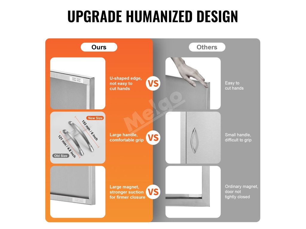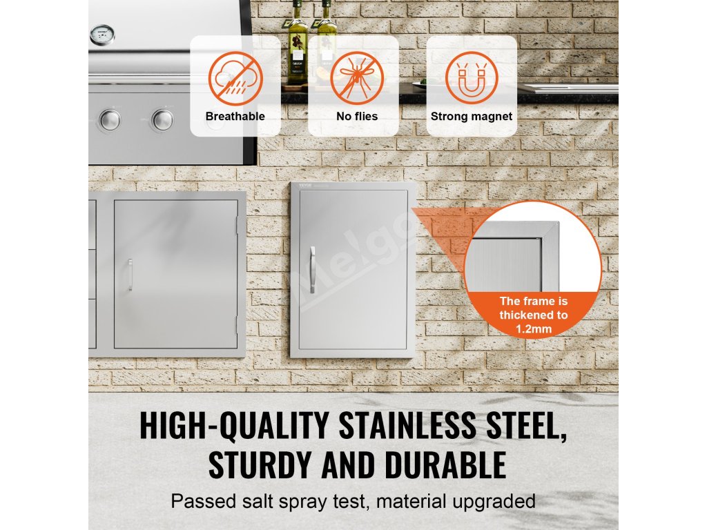 Tieto prístupové dvierka na gril sú vyrobené z robustnej konštrukcie z vysokokvalitnej nehrdzavejúcej ocele, odolné proti korózii, vode, poškriabaniu, ľahko sa čistia bez zanechania stôp alebo škvŕn. Úplne bezšvová konštrukcia, žiadne ostré rohy, čo zaisťuje bezpečnosť používateľa.