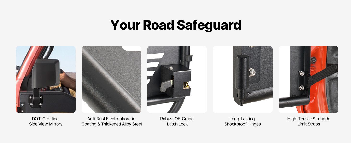 Rúrkové polodvere s náhradnými zrkadlami spĺňajúcimi normy DOT, zosilnenými rúrkami z legovanej ocele, zámkami v kvalite OE, tlmiacimi pántmi a vystuženými obmedzovacími popruhmi poskytujú viacvrstvovú ochranu. Vychutnajte si stabilnú jazdu na nerovných cestách alebo pri zmene jazdného pruhu na diaľnici.