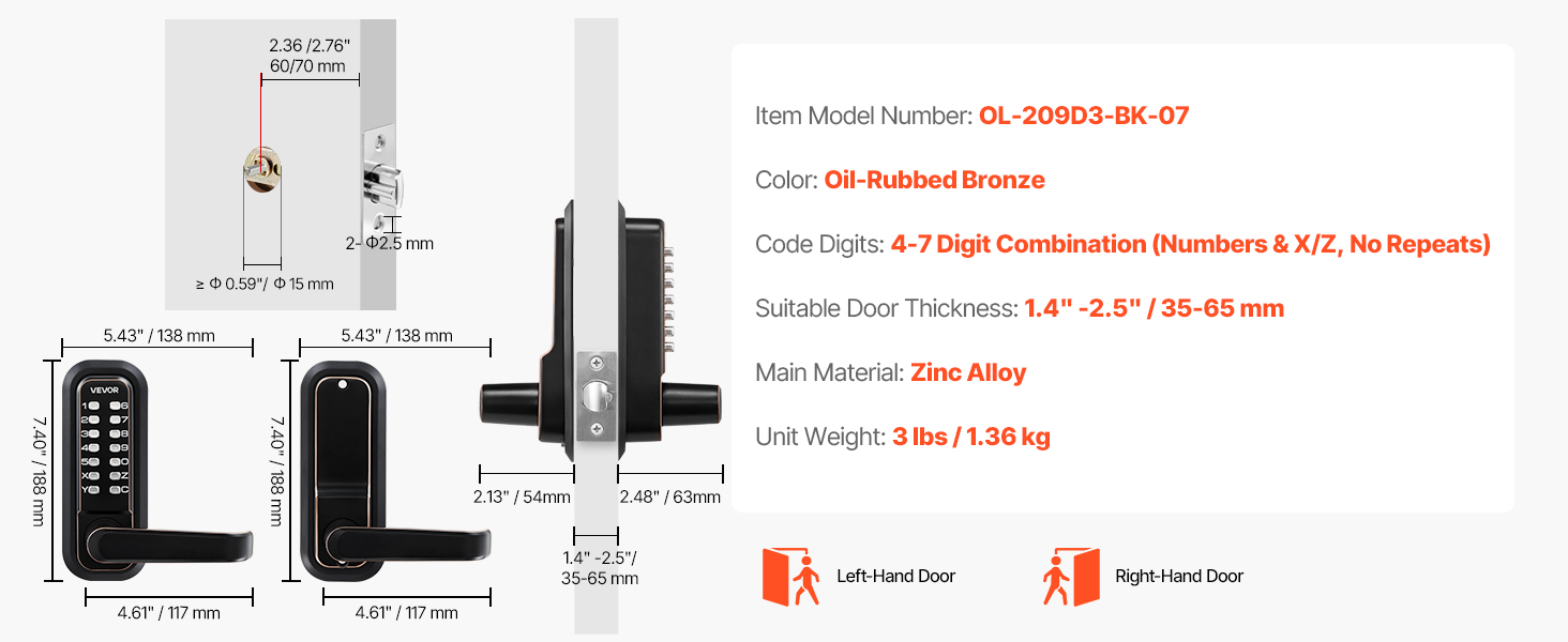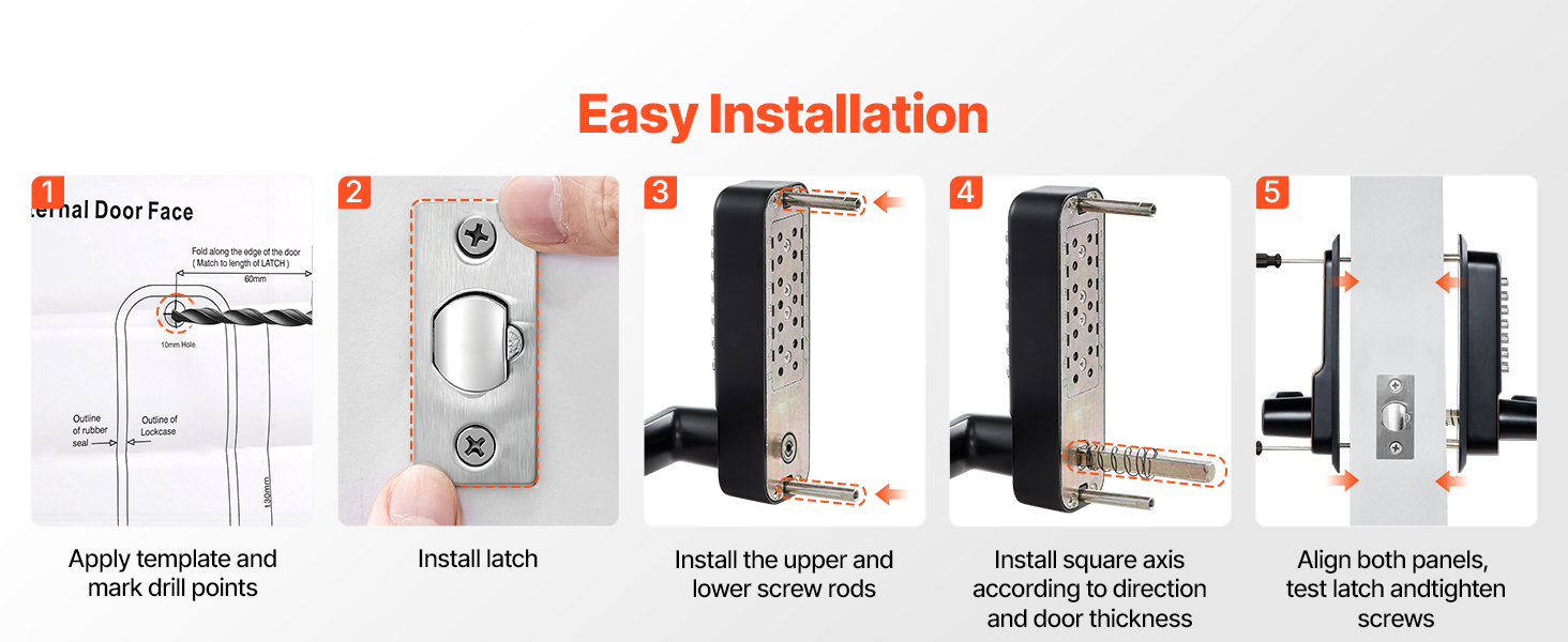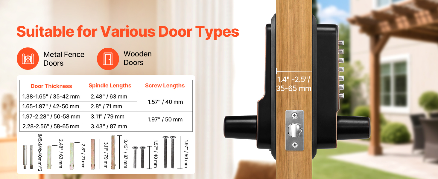 Tento mechanický bezkľúčový zámok je kompatibilný s kovovými bránami, drevenými dverami a radom štandardných hrúbok dverí. Obsahuje viacero hriadeľov a skrutiek, aby vyhovoval rôznym inštalačným požiadavkám.