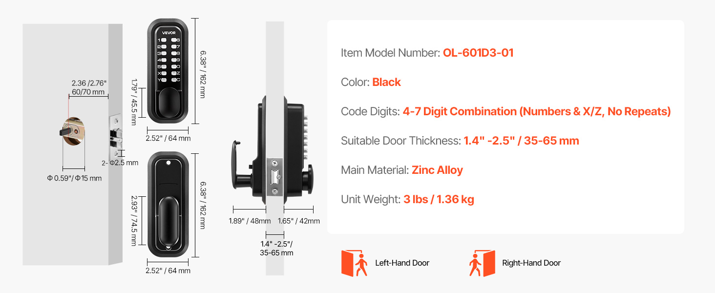| Vhodná hrúbka dverí | 1,4" -2,5" / 35-65 mm |