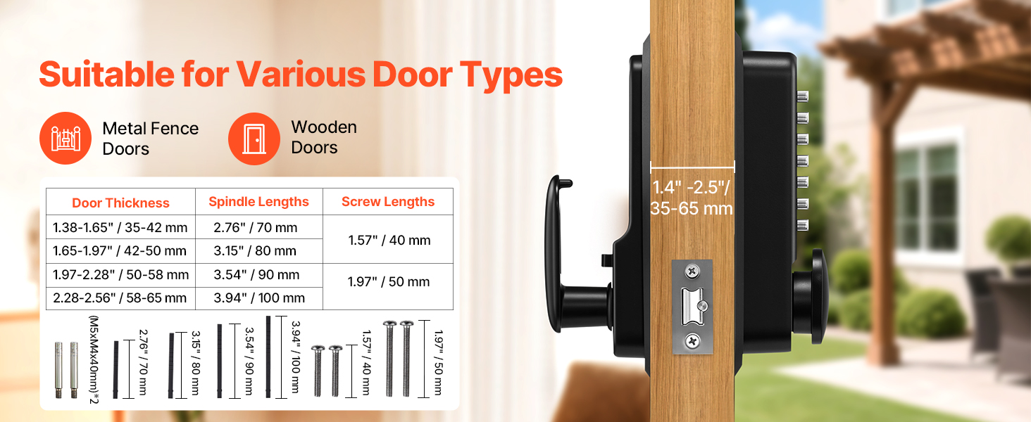 Tento mechanický bezkľúčový zámok je kompatibilný s kovovými bránami, drevenými dverami a radom štandardných hrúbok dverí. Obsahuje viacero hriadeľov a skrutiek, aby vyhovoval rôznym inštalačným potrebám.