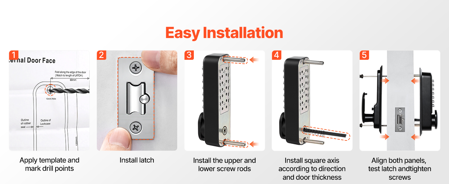 Nie je potrebné žiadne elektrické zapojenie ani zložité odstraňovanie chýb. Náš mechanický zámok dverí s klávesnicou sa hodí na väčšinu štandardných typov dverí a môže ho samostatne nainštalovať každý, čo šetrí čas a námahu.