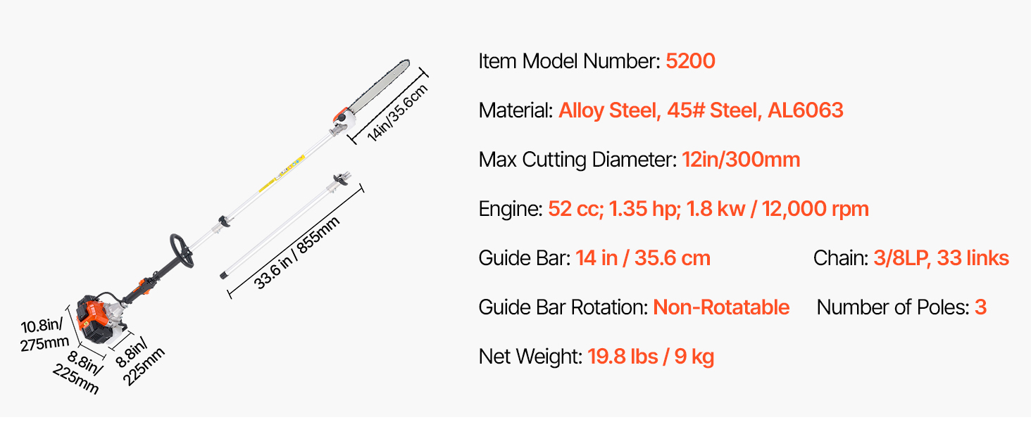 Plynová tyčová píla vybavená 2-taktným benzínovým motorom s objemom 52 cm3 poskytuje výkon 1,8 kW a dosahuje až 12 000 otáčok za minútu v spojení s 14" (35,6 cm) vodiacou lištou na rýchle a efektívne rezanie. Nemusíte sa starať o dĺžku kábla alebo výdrž batérie, pre vyššiu účinnosť rezania a stabilnú prevádzku.