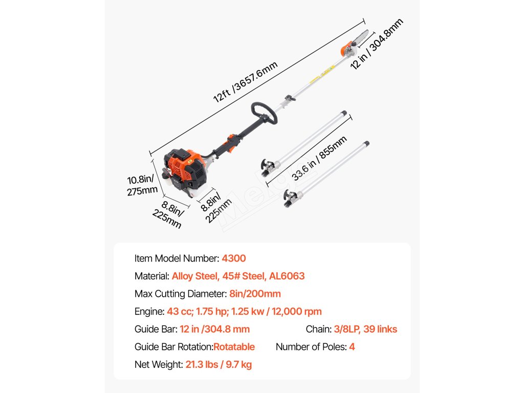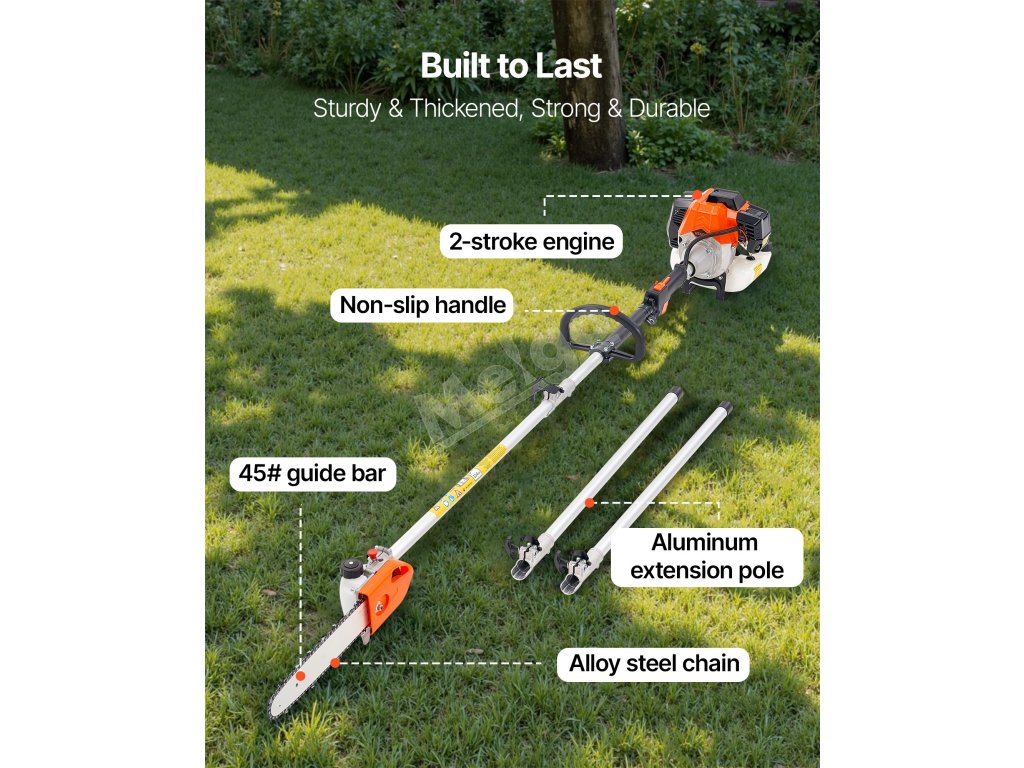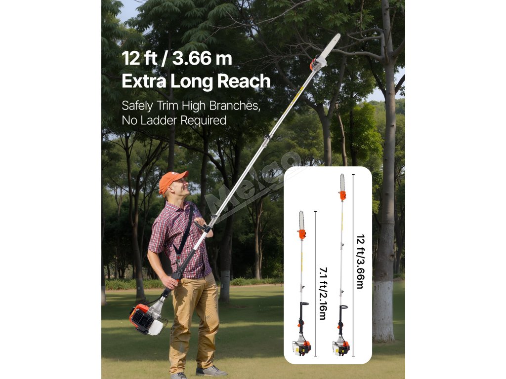Reťazová píla na tyč má ergonomický dizajn vrátane pohodlného ramenného popruhu a mäkkej rukoväte, aby sa minimalizovala únava počas dlhšieho používania. Výsuvná tyč uľahčuje skladovanie a prenášanie. Veľkokapacitná palivová nádrž a funkcia automatického mazania zabezpečujú bezproblémovú prevádzku.