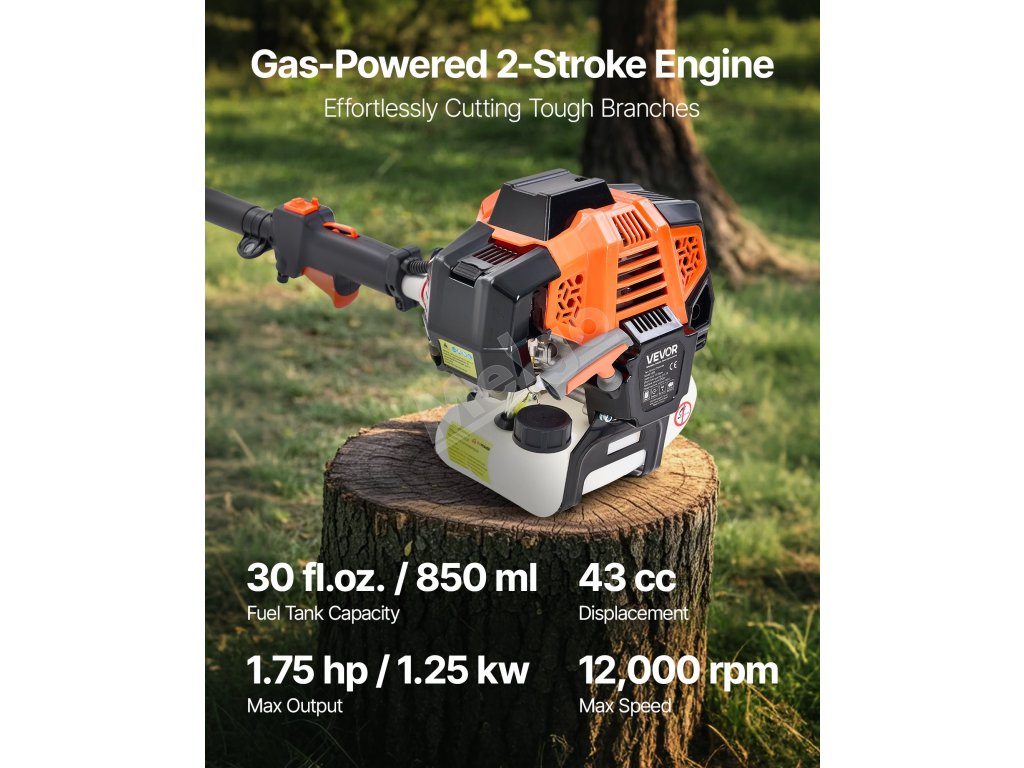 Akumulátorová píla na stĺpy vybavená 2-taktným benzínovým motorom s objemom 43 cm3 poskytuje výkon 1,25 kW a dosahuje až 12 000 otáčok za minútu, pričom je spojená s 12" vodiacou lištou na rýchle a efektívne rezanie. Nemusíte sa obávať dĺžky kábla ani výdrže batérie.