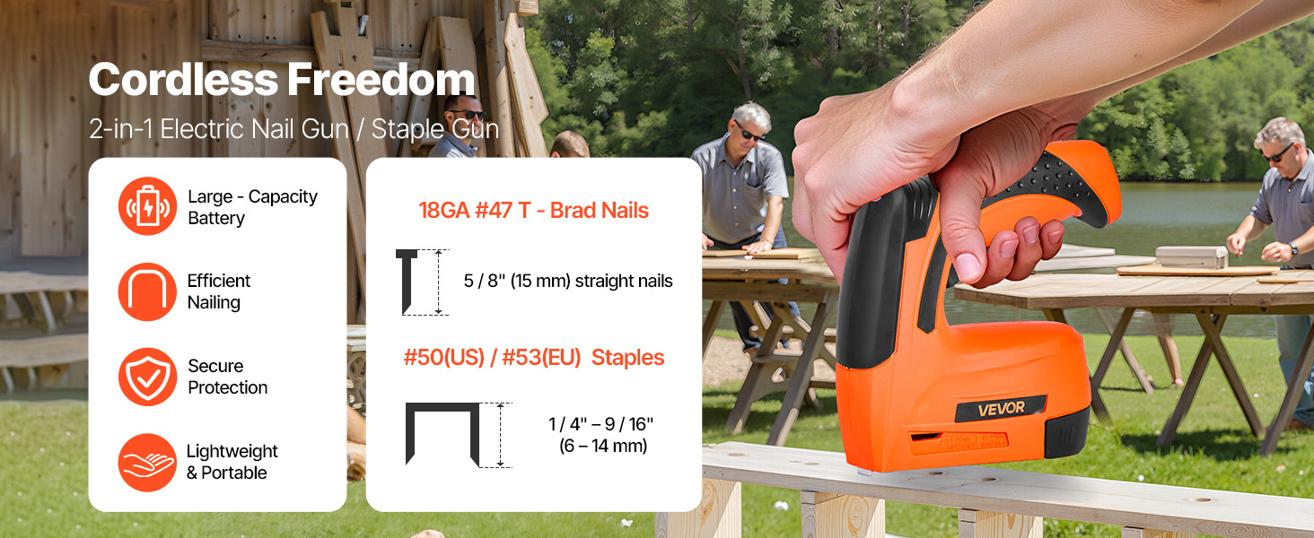 Táto akumulátorová klincovačka 2 v 1 kombinuje klincovačku a sponkovačku v jednom, bez káblov, ktoré by obmedzovali váš pohyb. Vezmite si ju kamkoľvek a ľahko zvládnite rôzne upevňovacie úlohy.