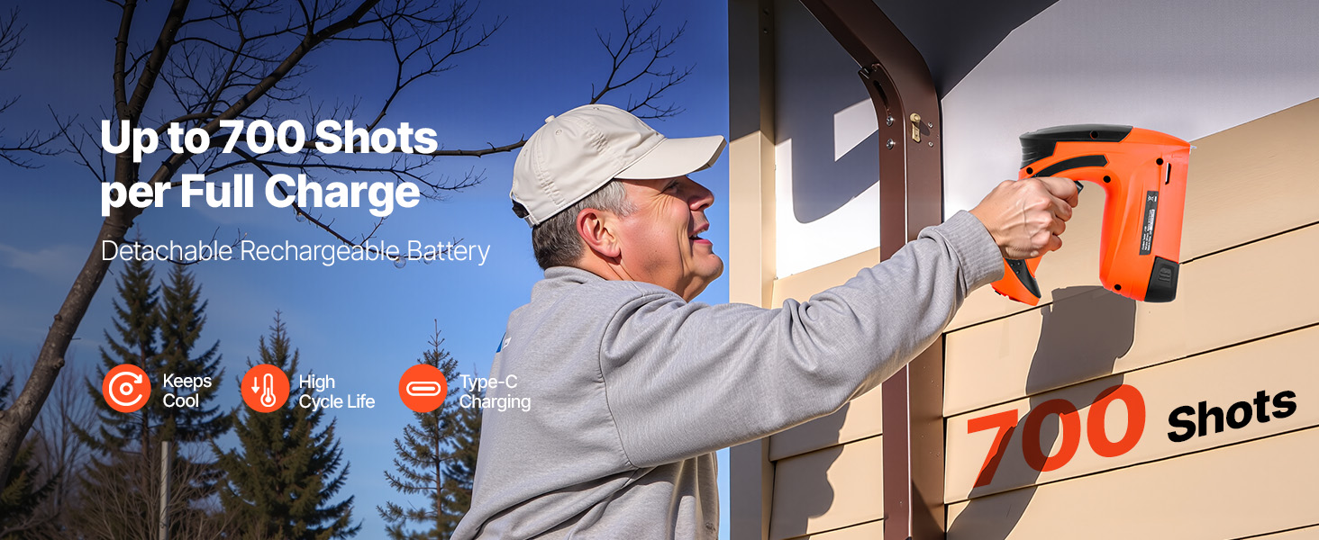 Táto akumulátorová klincovačka je vybavená vysokokapacitnou batériou, ktorá dokáže na plné nabitie vystreliť až 700 klincov. Akumulátor zaručuje dlhú životnosť a počas používania zostáva chladný, čo vám umožní pracovať dlhší čas bez prerušenia.
