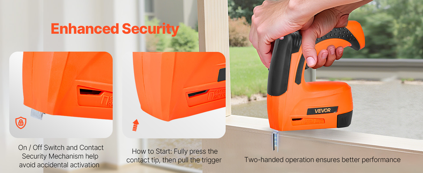 Spínač zapnutia/vypnutia v spojení s bezpečnostným mechanizmom kontaktov pomáha predchádzať neúmyselnej aktivácii. Ak chcete spustiť akumulátorovú sponkovačku, úplne stlačte kontaktný hrot a potom stlačte spúšť - dvojvrstvová ochrana pre väčšiu bezpečnosť.