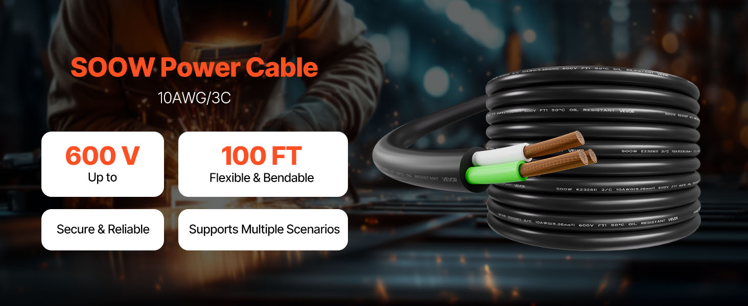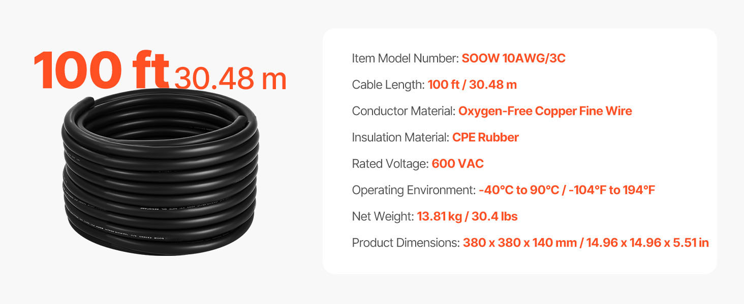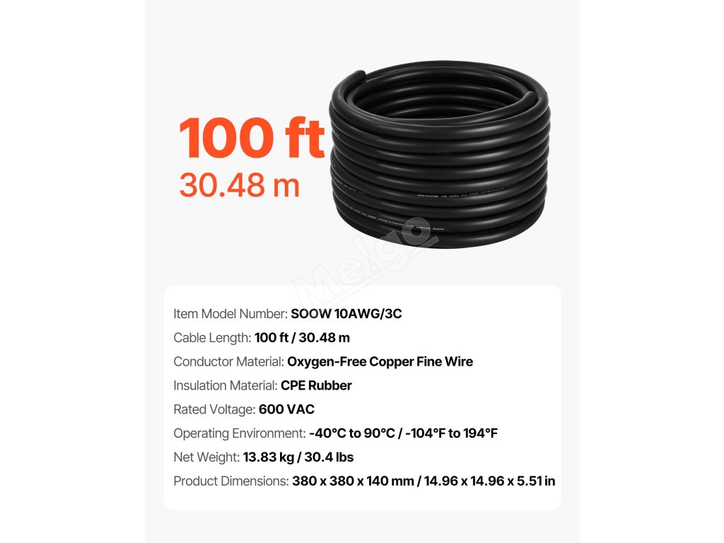 Predlžovací elektrický kábel 30,48 m dlhý 10 awg (6 mm²) medený