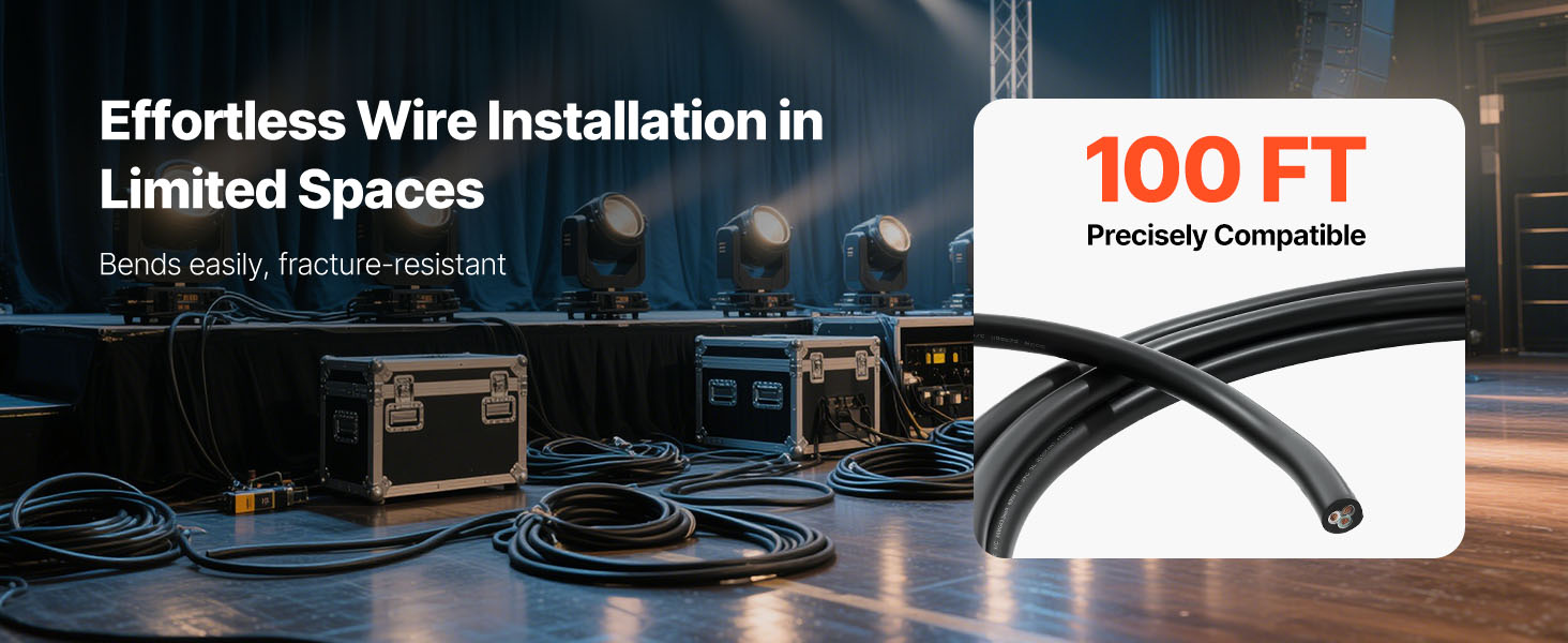 Elektrický napájací kábel je flexibilný a odolný voči ohybu, vďaka čomu sa ľahko pohybuje v stiesnených priestoroch, ako sú javiskové zostavy, priestory generátorov vozidiel a priestory pre zariadenia. Možno ho voľne ohýbať bez obáv z poškodenia, čím sa zlepšuje účinnosť kabeláže v uzavretých priestoroch.