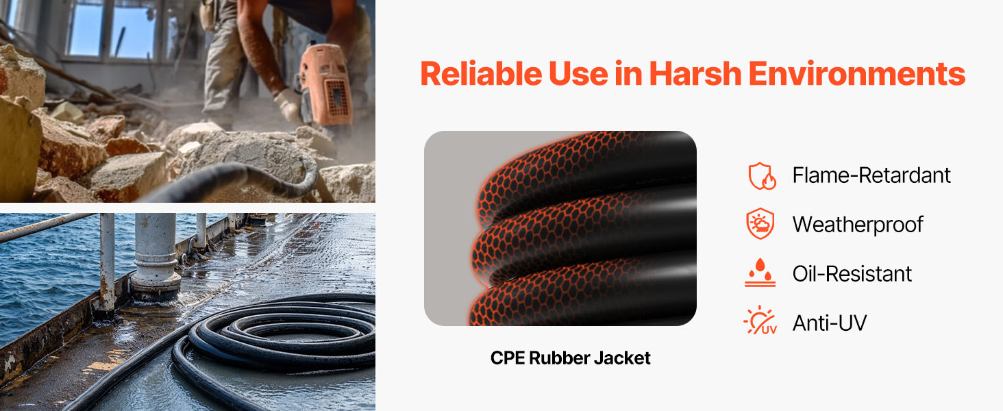 Vďaka plášťu CPE odolnému voči chemickej korózii tento elektrický predlžovací kábel zabraňuje zamrznutiu pri teplote -40 ℃/-104℉ a zmäknutiu pri teplote 90 ℃/194℉. Jeho konštrukcia odolná voči tlaku, výbuchu a plameňom je vhodná do drsných prostredí, ako sú továrne, a poskytuje bezpečné používanie energie.