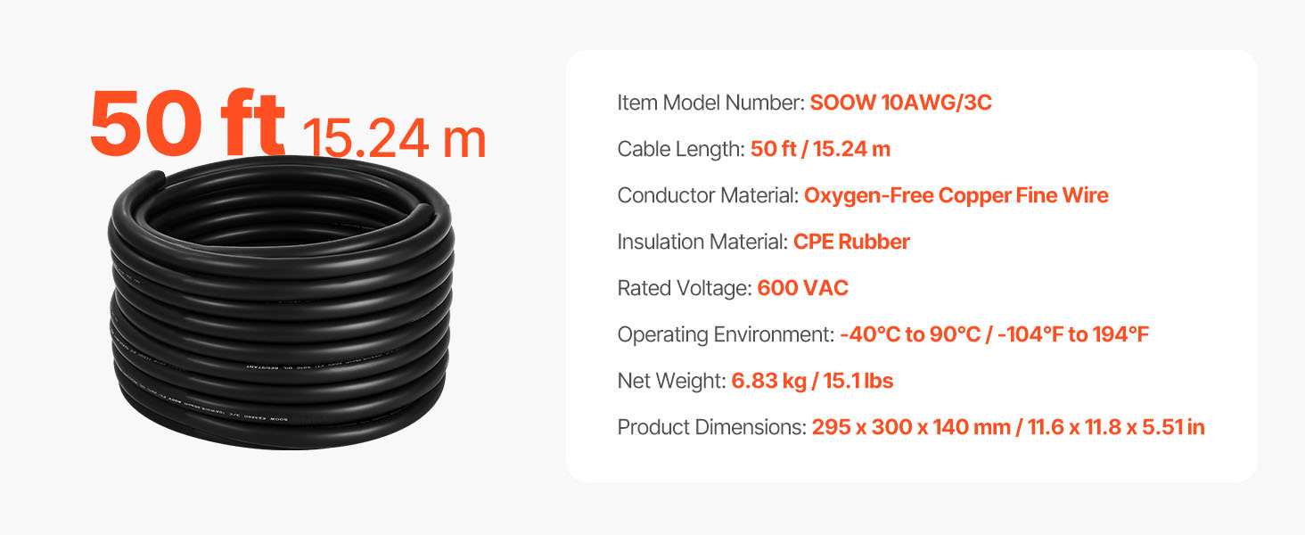 Predlžovací elektrický kábel 50 ft (15.24 m) 10awg (6 mm²) medený