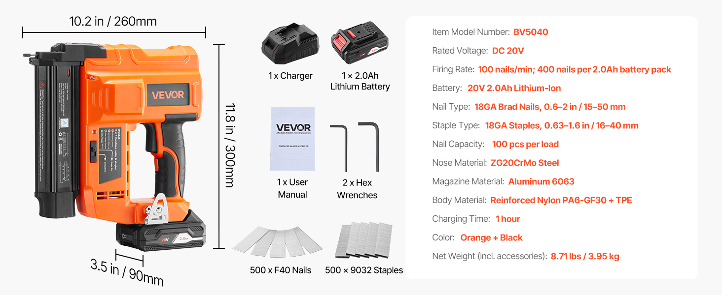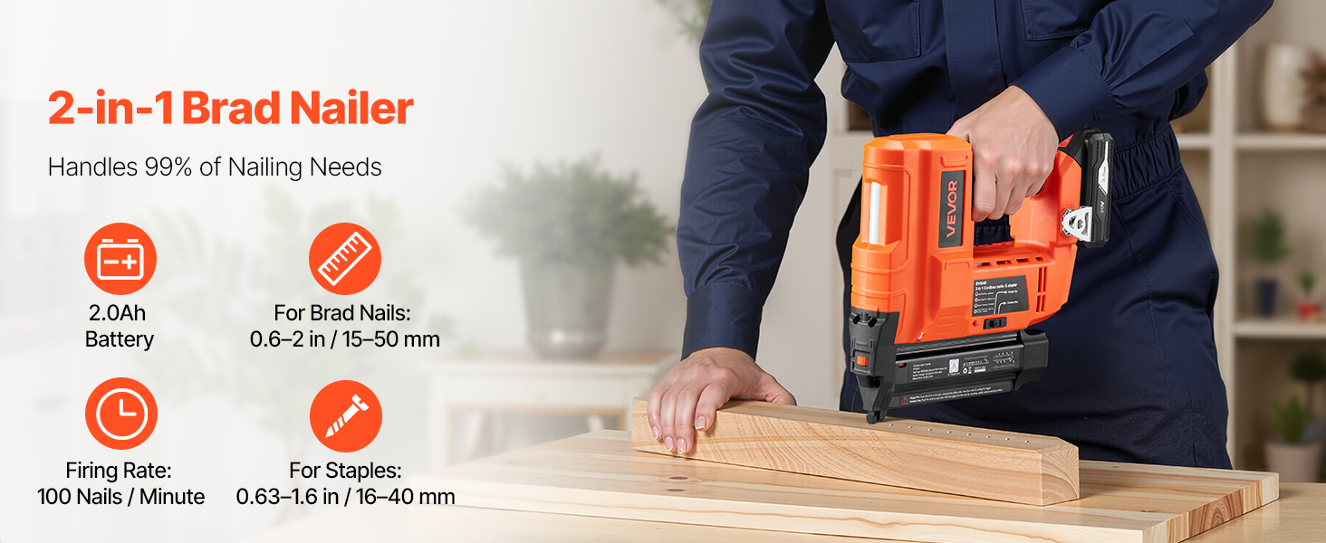 Akumulátorová klincovačka je kompatibilná s klincami s priemerom 0,6-2,2 palca (15-55 mm) a sponkami s priemerom 0,6-1,6 palca (16-40 mm). Ľahko zvládne upevňovanie a dekoráciu.
