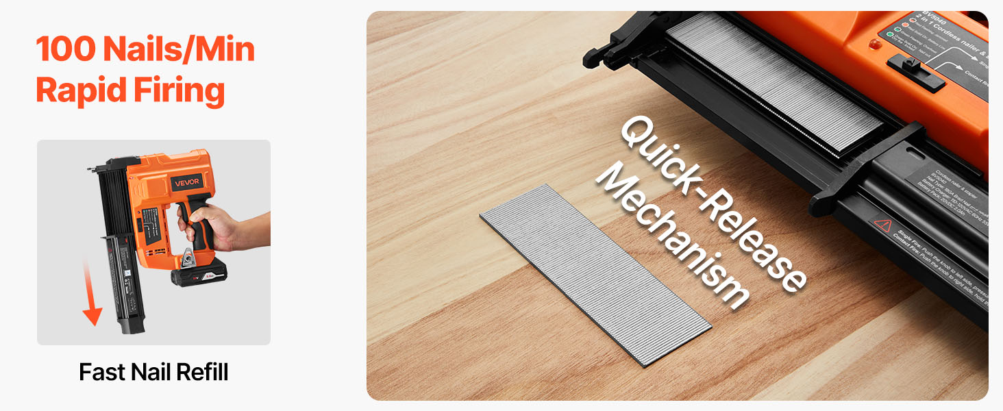 Naša batériová klincovačka podporuje rýchlosť streľby až 100 klincov/min, čo je vhodné pre veľké projekty vyžadujúce rýchlosť aj presnosť. Jej režim nepretržitej streľby zabezpečuje plynulý, neprerušovaný výkon.