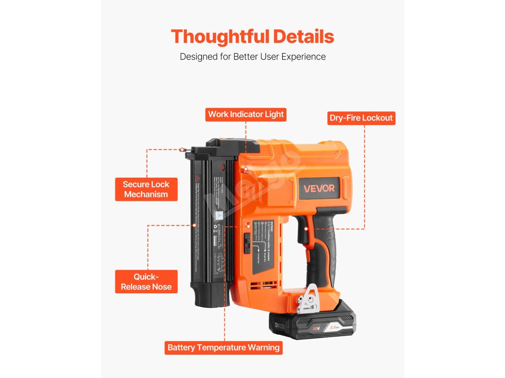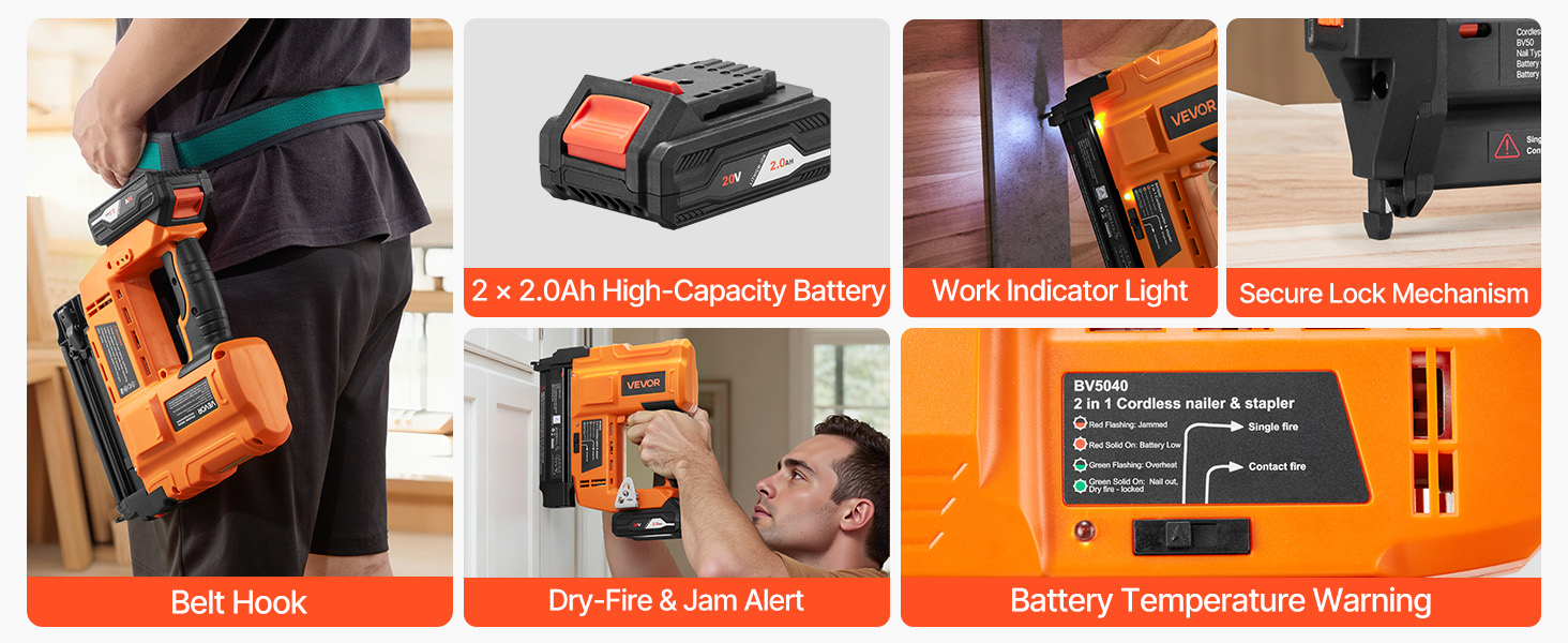 Táto akumulátorová klincovačka, vybavená bezpečnostným zámkom, ochranou proti streľbe nasucho, viditeľným svetelným indikátorom práce a systémom varovania pred zaseknutím, je odolná voči náhodnému vystreleniu a poškodeniu nástroja. Každý detail je navrhnutý tak, aby chránil vás a váš pracovný priestor.
