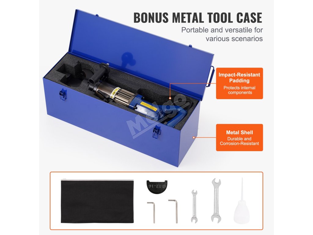 Hydraulická elektrická ohýbačka výstuže vám pomôže rýchlo dokončiť úlohy vďaka širokému rozsahu ohýbania a dodávanému boxu na náradie. Či už na stavenisku alebo v inom prostredí, môžete začať pracovať rýchlo.