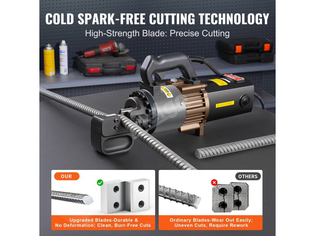 Naše vysokokvalitné nože sú navrhnuté na rezanie na oboch stranách tyče, zatiaľ čo viackruhová matica zvyšuje bezpečnosť a umožňuje otáčanie matice v polohe rezania, aby sa prispôsobila rôznym priemerom armovacích tyčí.