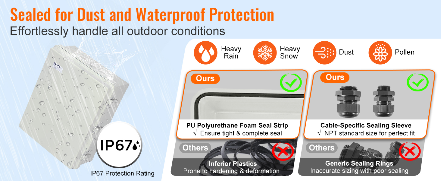 Používame vysokokvalitný tesniaci materiál z polyuretánovej peny PU, čím dosahujeme stupeň odolnosti proti prachu IP6 a stupeň vodotesnosti IP7. Poskytujeme výnimočnú ochranu pred nepriaznivými poveternostnými podmienkami, čím zabezpečujeme, že elektrické zariadenia zostanú neovplyvnené nepriaznivými podmienkami.