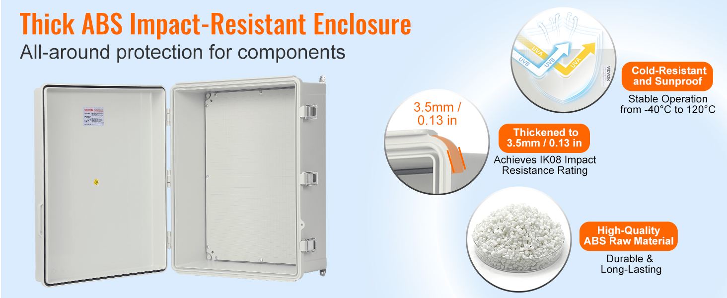 Naša rozvodná skrinka odolá nárazovej sile 2,5 kilogramu, čím účinne chráni vnútorné komponenty aj v prípade náhodného nárazu. Náš kryt je vyrobený zo zhrubnutého materiálu ABS s hrúbkou 0,13/ 3,5 mm a vysokou tvrdosťou povrchu, vďaka čomu je ideálnou voľbou na použitie vo vonkajšom prostredí.