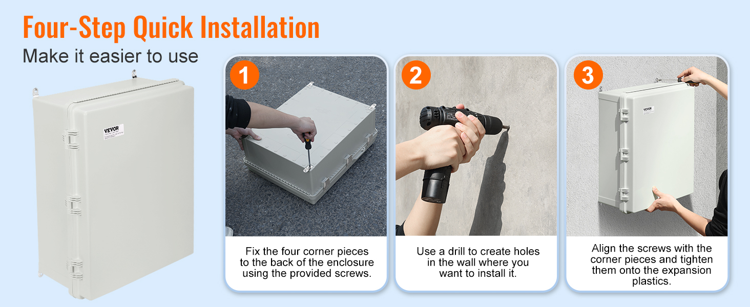 Naša elektrická spojovacia skrinka z ABS sa môže pochváliť vonkajšími rozmermi 20,87 x 16,92 x 7,87 palca/530 x 430 x 200 mm a vnútornými rozmermi 19,01 x 15,08 x 7,12 palca/483 x 383 x 181 mm, čo poskytuje dostatok priestoru na jednoduché zapojenie. Zvýšte úroveň uskladnenia elektrických komponentov pomocou našej elektrickej skriňovej skrinky!