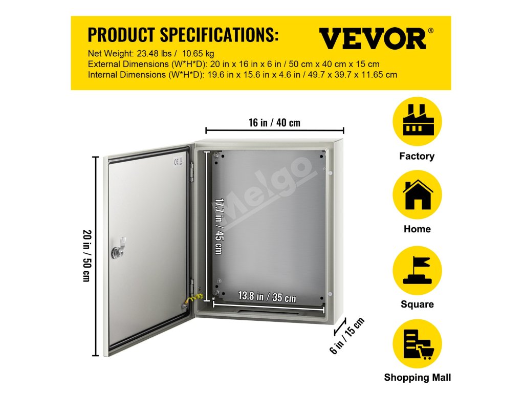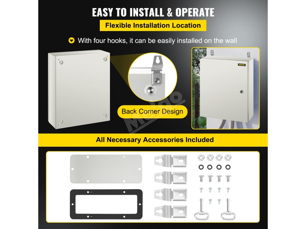 Odnímateľná pozinkovaná zadná doska s rozmermi 2 MM umožňuje jednoduchú inštaláciu dosiek plošných spojov, svoriek alebo iných elektrických komponentov, ktoré je potrebné upevniť. Na zadnej strane sa nachádzajú aj štyri montážne otvory na jednoduchú montáž na stenu.