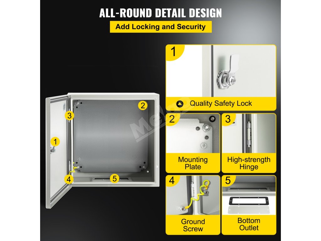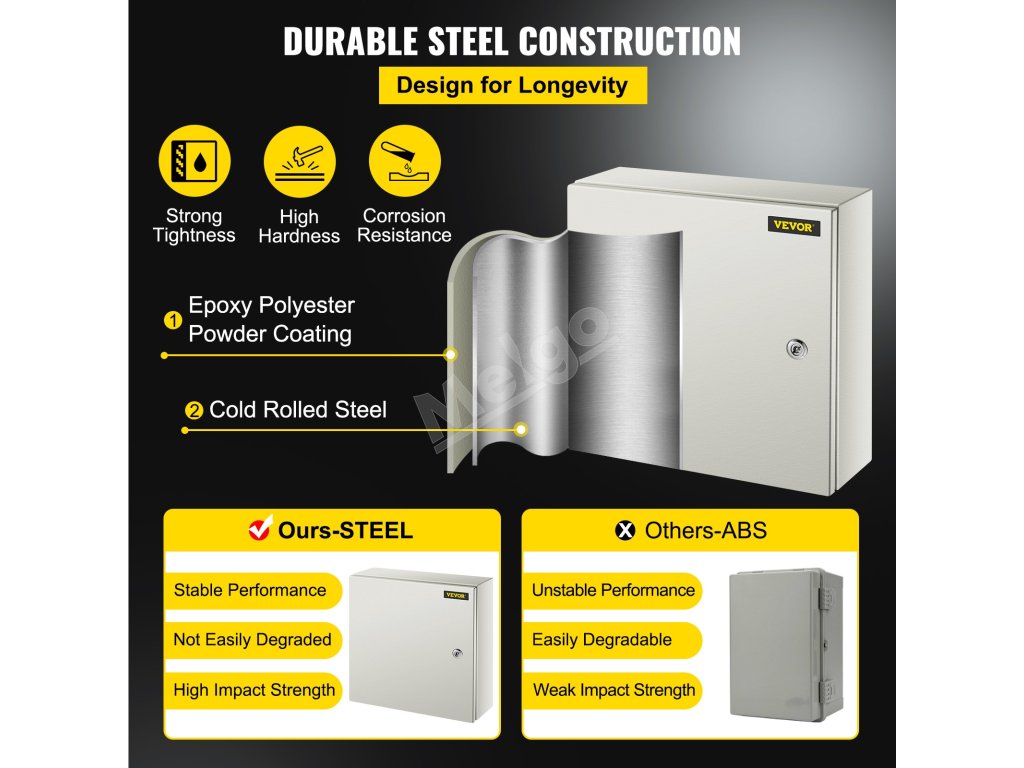 Elektrická skrinka je vyrobená z ocele valcovanej za studena s hrúbkou 0,059''/1,5 mm, vyznačuje sa vysokou húževnatosťou, odolnosťou proti tlaku a hrdzaveniu. Plášť je vyrobený z epoxidového polyesterového práškového laku, ktorý má dobré mechanické a vyrovnávacie vlastnosti.