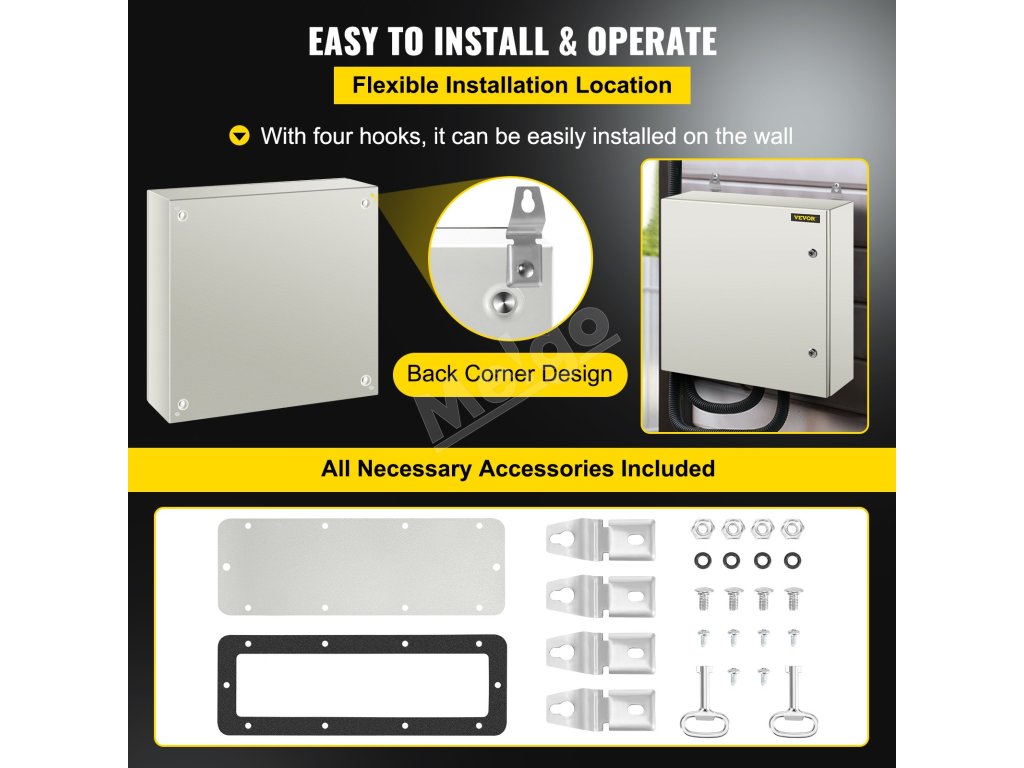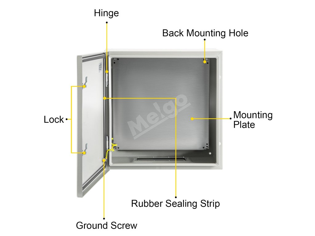 Odnímateľná pozinkovaná zadná doska s rozmermi 2 MM umožňuje jednoduchú inštaláciu dosiek plošných spojov, svoriek alebo iných elektrických komponentov, ktoré je potrebné upevniť. Na zadnej strane sa nachádzajú aj štyri montážne otvory na jednoduchú montáž na stenu.
